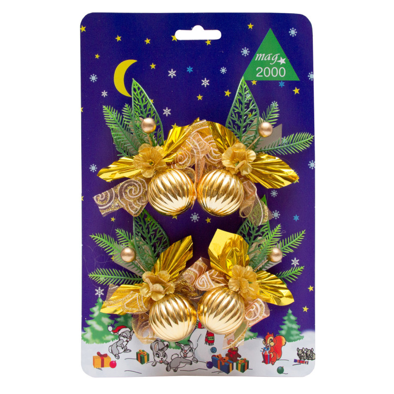 4 хвойних гілочки з золотими прикрасами на прищіпках, 6x10 см (470518)