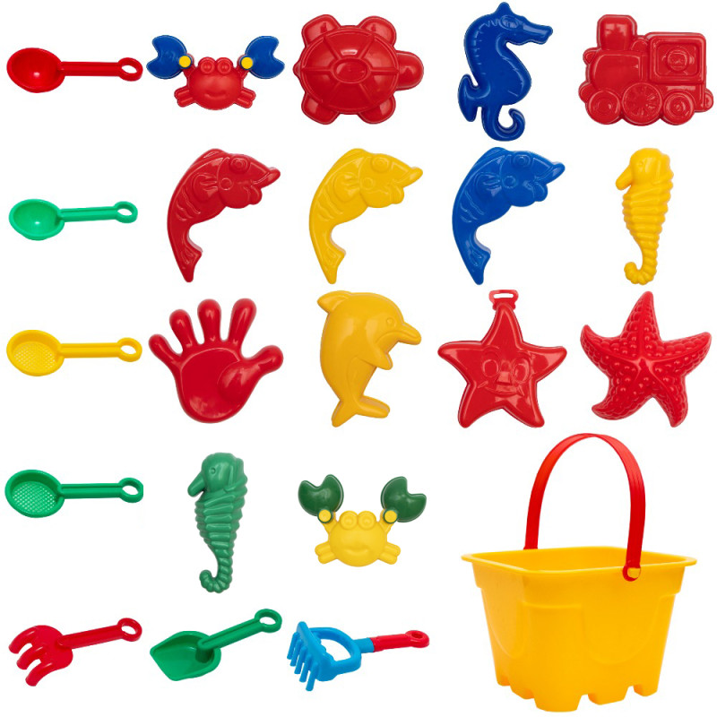 • Вміст: відро-формочка 10,5 см - 1 шт, совочок 13 см - 2 шт, ситечко 13 см - 2 шт, грабельки 13 см - 2 шт, лопатка 13 см - 1 шт, формочки від 9.5 до 20 см - 14 шт.
