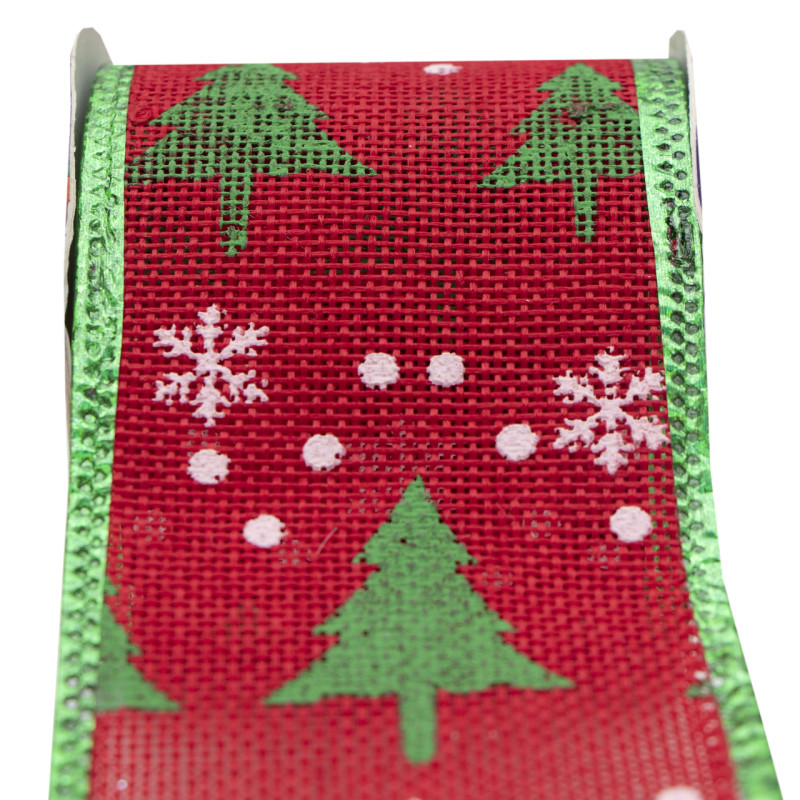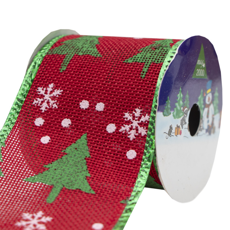 Декоративна прикраса - стрічка в рулоні зелена ялинка та біла сніжинка, 3 м, 6,3 см, поліестер (080594-2)