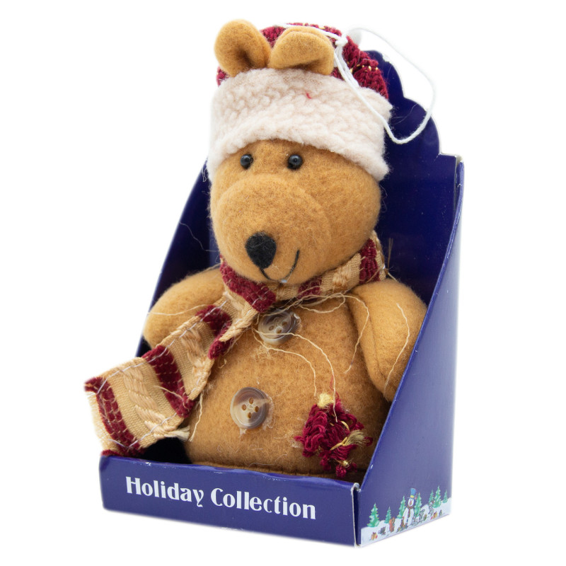 Ялинкова іграшка м'яка - Ведмідь з бордовою кишенею, 14 см, коричневий, текстиль (000029-21)