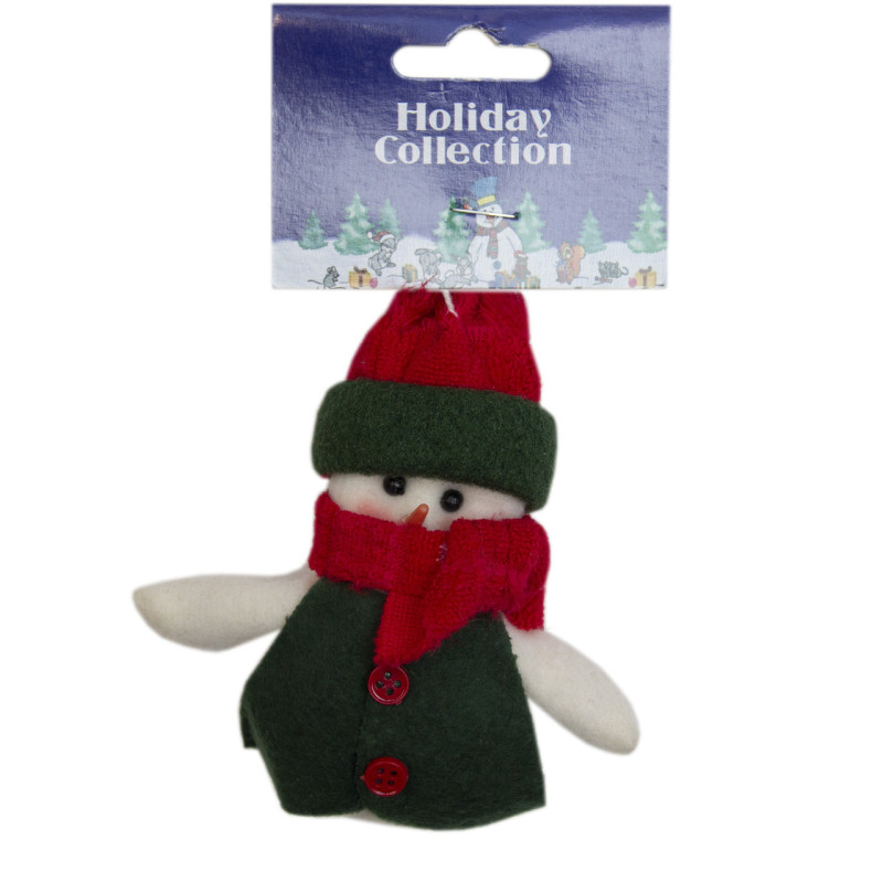 Ялинкова іграшка м'яка - Сніговик в зеленій кофті з червоним шарфом, 9 см, білий із зеленим, текстиль (000258-5)