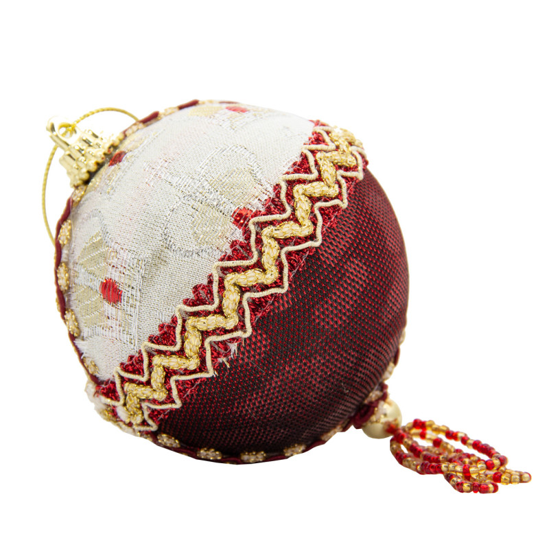 Ялинкова іграшка - куля з тканини вишита бісером, D10 см, червона, біла, текстиль (430246-4)
