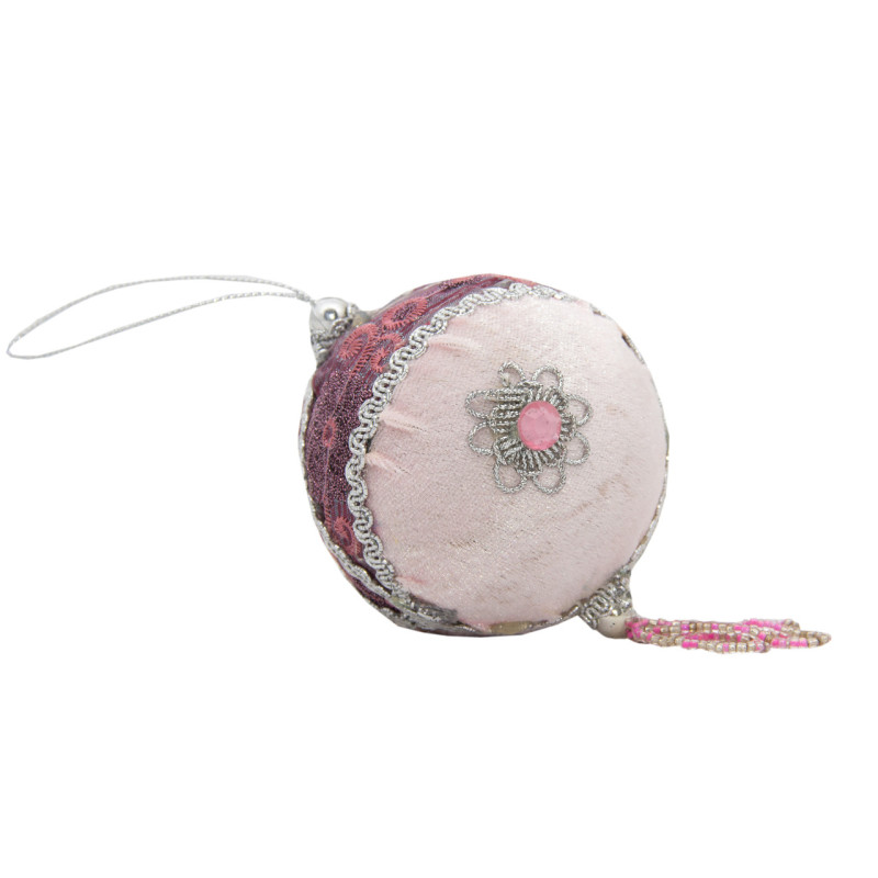 Ялинкова іграшка - куля з тканини вишита бісером, D10 см, рожева, текстиль (430222-4)