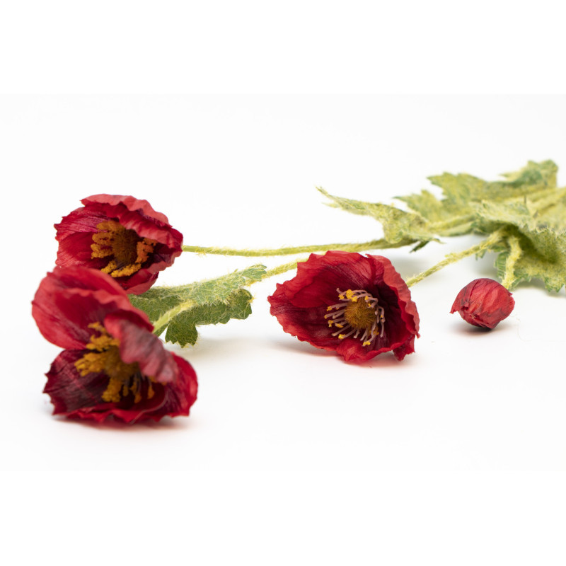 Гілка з трьома квітами (3 розпущені квітки і 1 бутон) і листям. Також, увесь виріб покрито шорсткою тканиною, що надає більш натуральний ефект квітці.