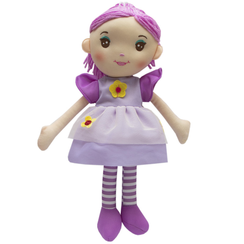 М'яка іграшка лялька з вишитим обличчям, 36 см, одна жовта квітка, фіолетова сукня (861057-3)