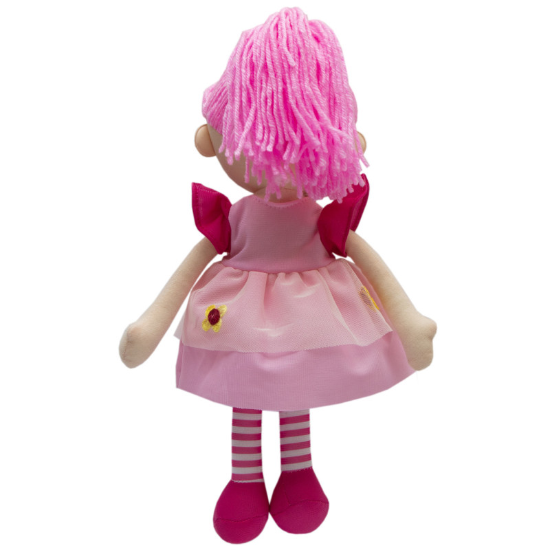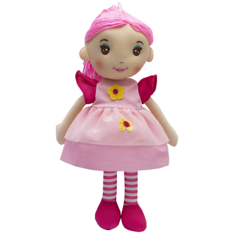 М'яка іграшка лялька з вишитим обличчям, 36 см, одна жовта квітка, рожева сукня (861071-3)