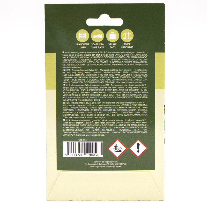 Якщо у вас залишилися питання, ви можете зв'язатися з нами будь-яким зручним способом Що може бути приємніше, аніж одягати чисту білу футболку, від якої віє свіжістю? Або лягати спати на постільну білизну, яка злегка хрумтить і пахне вашим улюбленим ароматом? Такі чудові дрібниці роблять наше побутове життя приємним і комфортним. А щоб речі й текстиль завжди мали легкий запах, то в шафу можна покласти пакетик саше. Це саше вироблено в Італії й лінійка включає в себе аромати: лаванди, бавовни, мускусу, ванілі, сандалу, цитруса, білих квітів і троянди. В одній упаковці є 2герметично запакованих саше. А їхній смачний запах протримається в зачиненій шафі до 2 місяців.