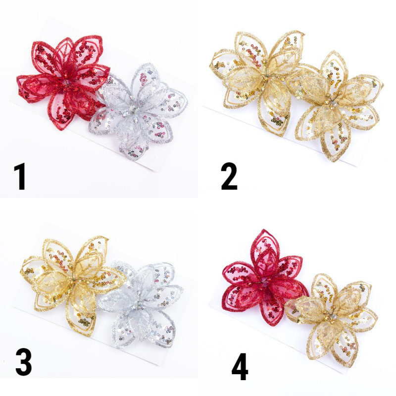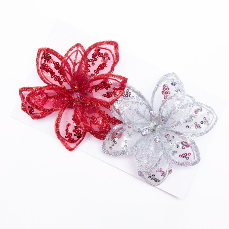 Набір ялинкових іграшок - квіти на кліпсі, 2 шт, 11 см, червоний, сріблястий, органза (780150-1)
