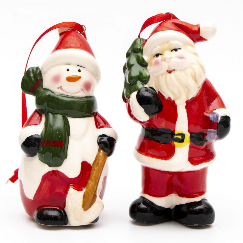 Набір ялинкових іграшок - Два сніговика на мотузці, 2 шт, 9 см, червоний, кераміка (440078-2)