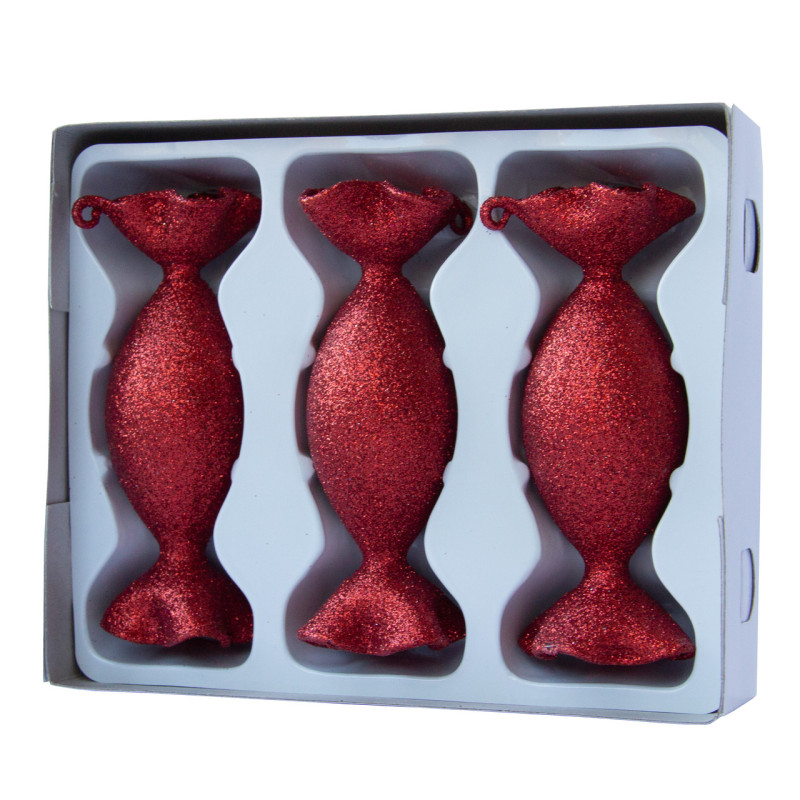 Набір ялинкових іграшок - цукерки, 3 шт, 3,5x10 см, червоний, гліттер, скло (390151-10)