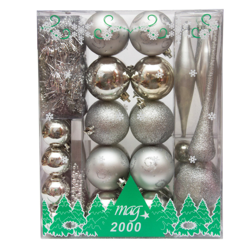 Набір ялинкових іграшок - новорічний, 55 шт, D3-4-6 см, сріблястий, мікс, пластик (030279-1)
