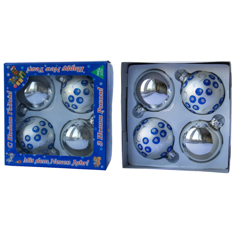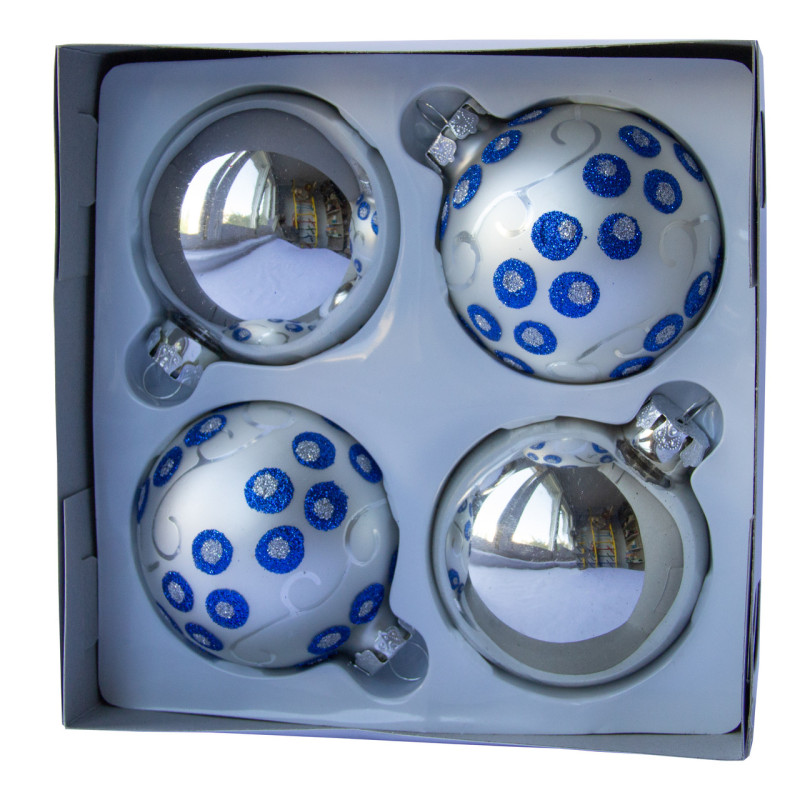 Набір ялинкових іграшок - кулі, 4 шт, D7 см, сріблястий, мікс, в синю крапку, скло (390335-15)