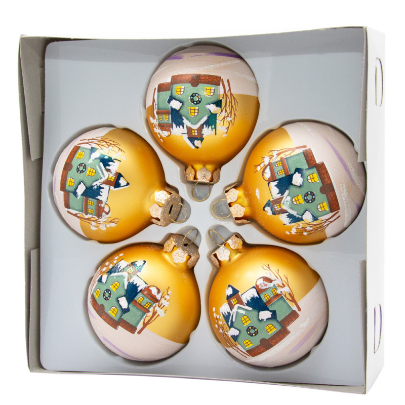 Набір ялинкових іграшок - кулі з розписом, 5 шт, D6 см, золотистий, матовий, скло (390410-5)