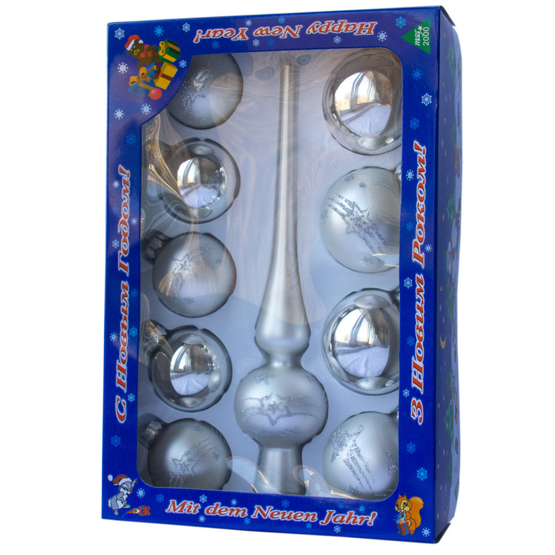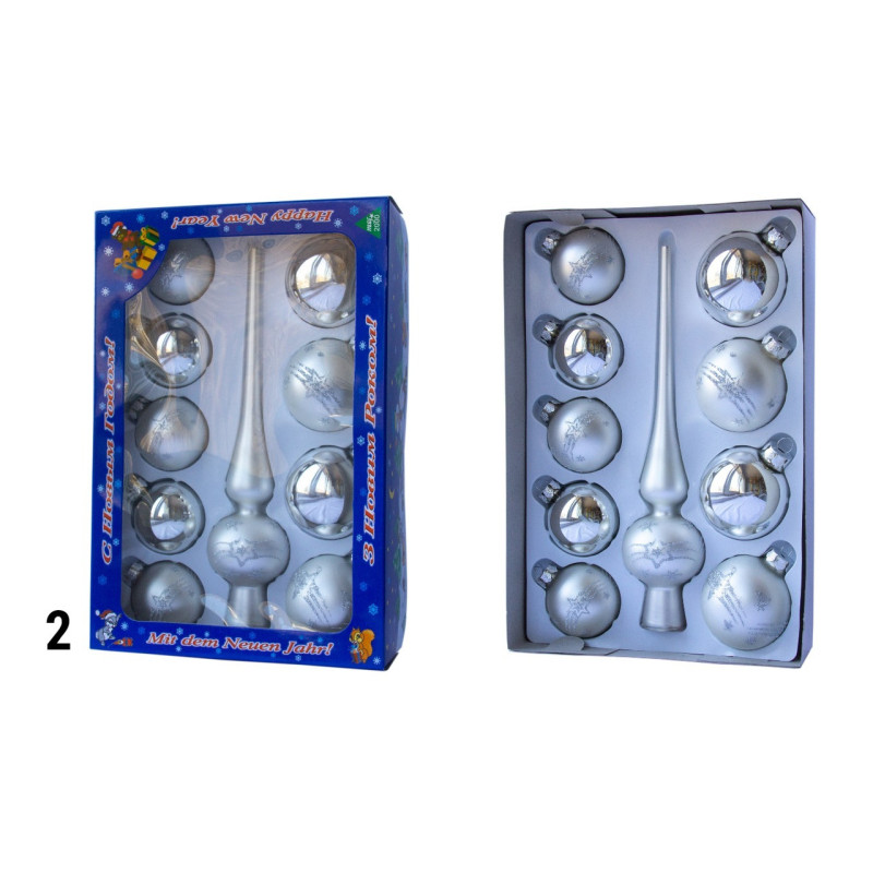 Набір ялинкових іграшок - кулі з верхівкою, 10 шт, D5-6 см, сріблястий, маленькі зірки, скло, мікс (390267-2)