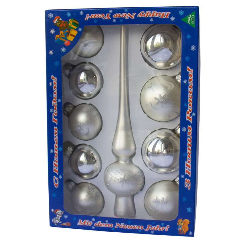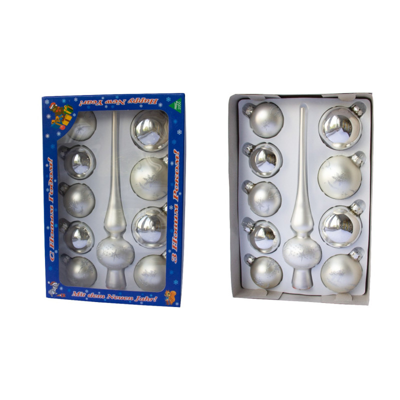 Набір ялинкових іграшок - кулі з верхівкою, 10 шт, D5-6 см, сріблястий, в сніжинки, скло, мікс (390267-14)