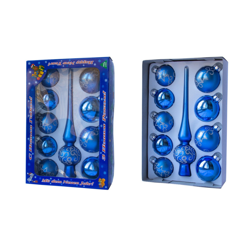 Набір ялинкових іграшок - кулі з верхівкою, 10 шт, D5-6 см, синій, з хвилями, мікс, скло (390267-21)
