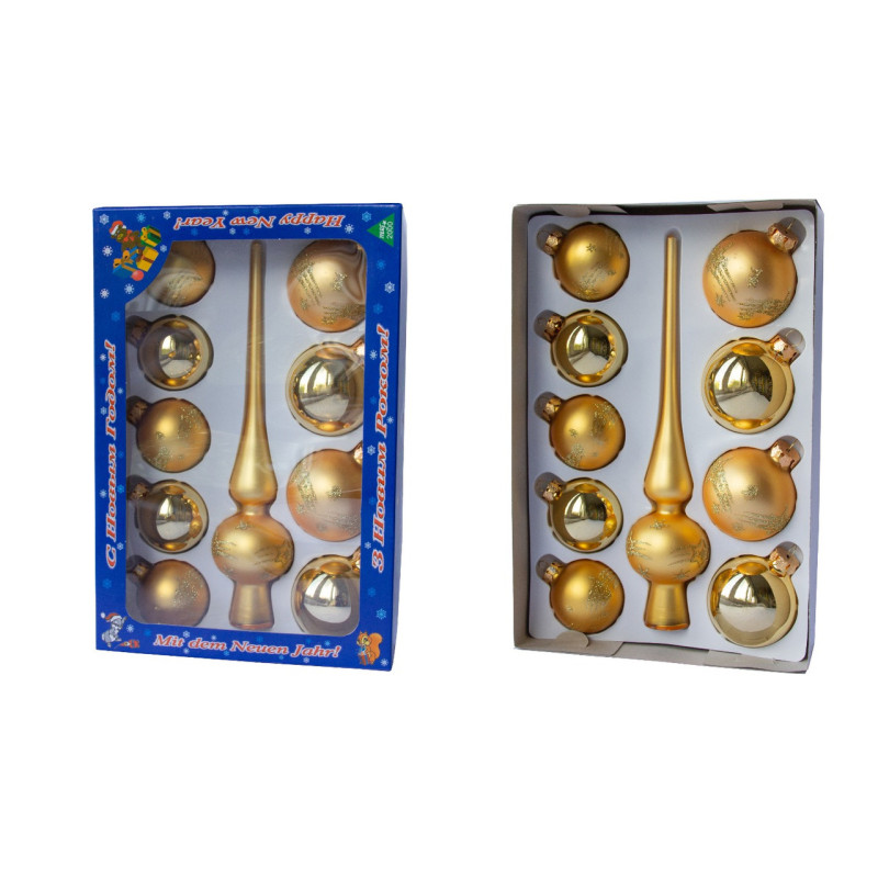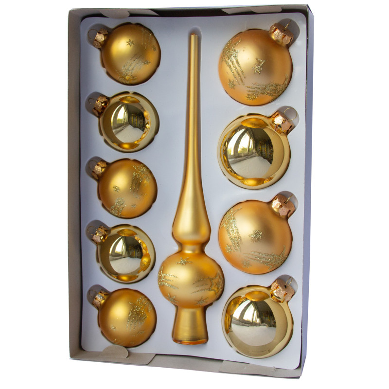 Набір ялинкових іграшок - кулі з верхівкою, 10 шт, D5-6 см, золотистий, у маленькі зірки, скло, мікс (390267-17)