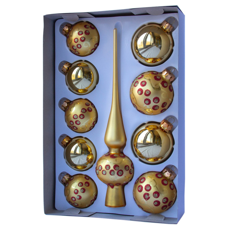 Набір ялинкових іграшок - кулі з верхівкою, 10 шт, D5-6 см, золотистий, в крапку, скло, мікс (390267-3)