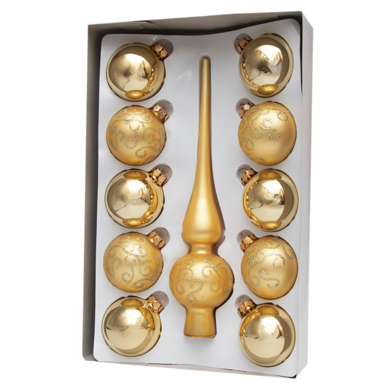 Набір ялинкових іграшок - кулі з верхівкою, 11 шт, D6 см, скло, золотистий, у маленькі хвилі, мікс (390236-10)