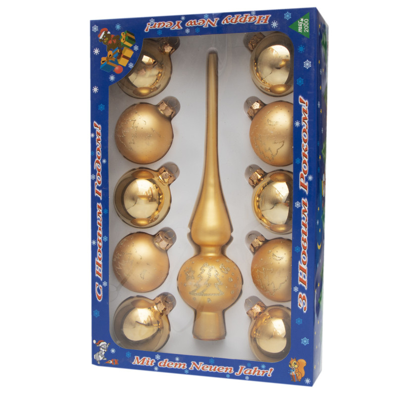 Набір ялинкових іграшок - кулі з верхівкою, 11 шт, D6 см, золотистий, візерунок ялинки, скло, мікс (390236-8)