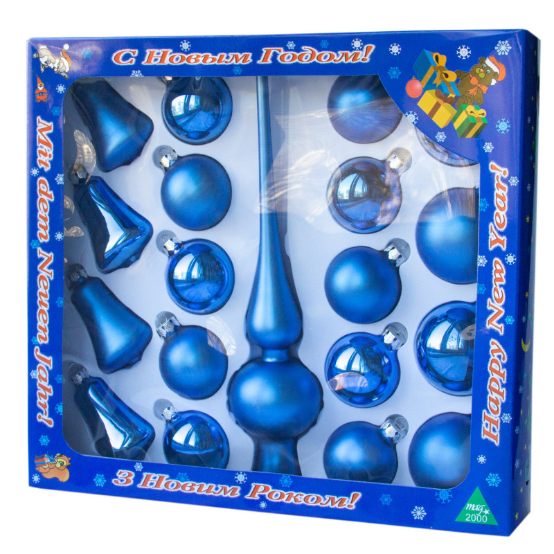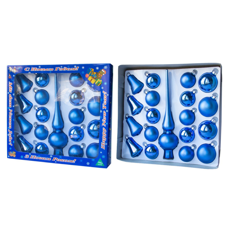 Набір ялинкових іграшок - кулі з верхівкою, 19 шт, D5-6 см, синій, скло, мікс (390212-4)