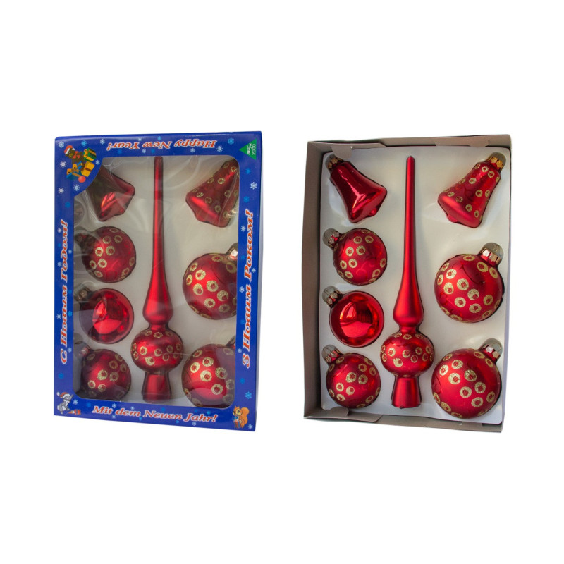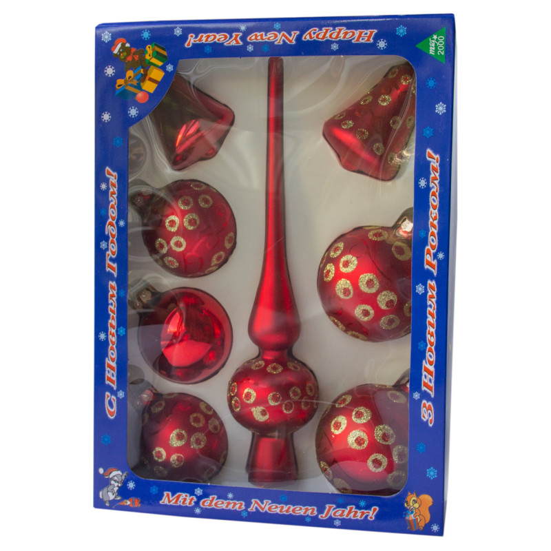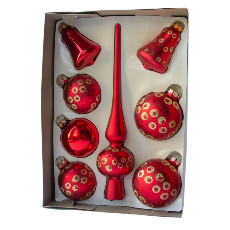 Набір ялинкових іграшок - кулі з верхівкою, 8 шт, D6-8 см, червоний, в крапку, скло, мікс (390281-10)