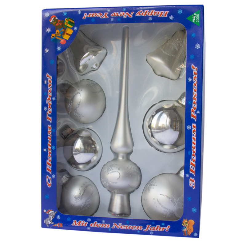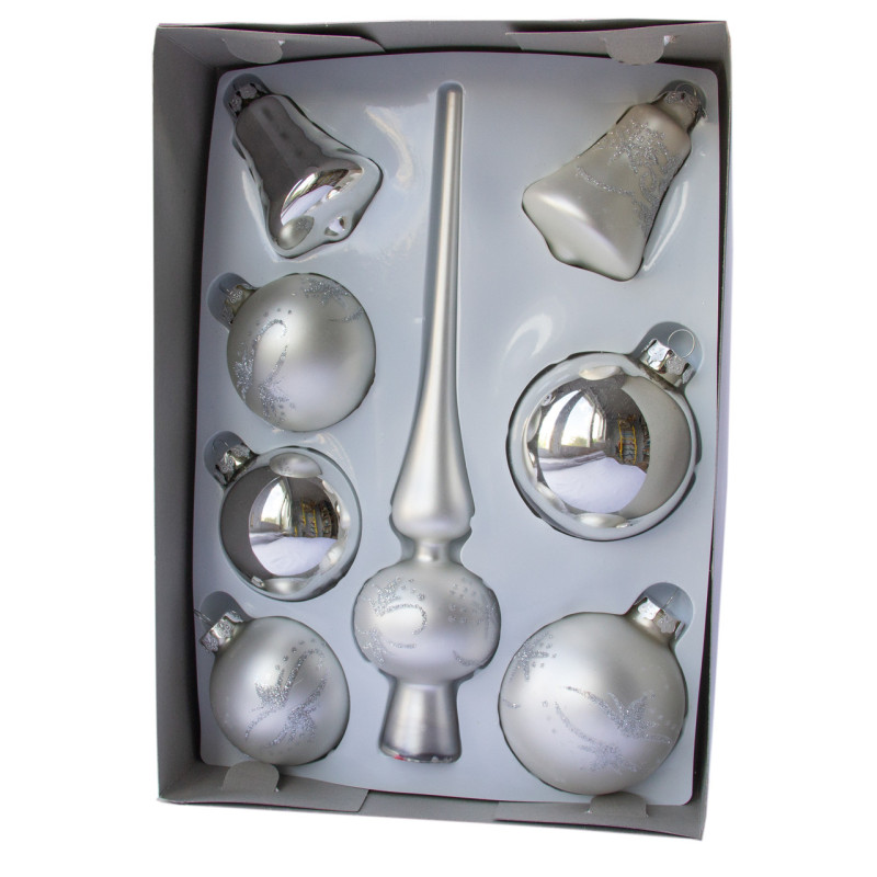Набір ялинкових іграшок - кулі з верхівкою, 8 шт, D6-8 см, сріблястий, в сніжинки, скло, мікс (390281-19)