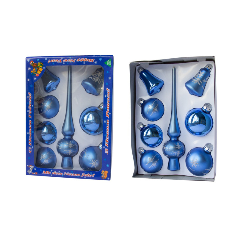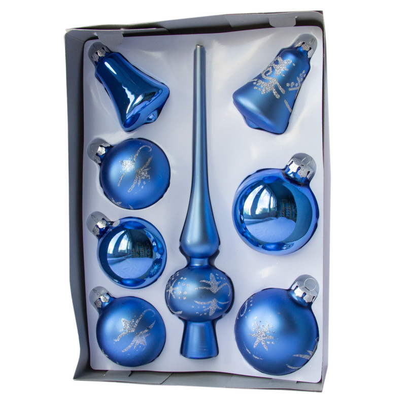 Набір ялинкових іграшок - кулі з верхівкою, 8 шт, D6-8 см, синій, сніжинку, скло, мікс (390281-15)