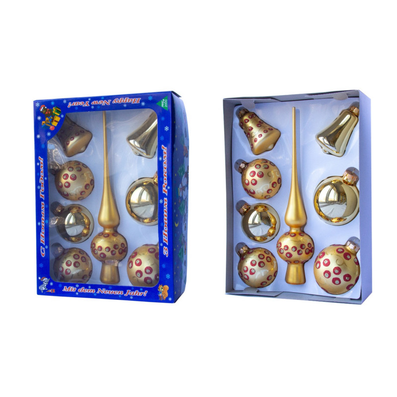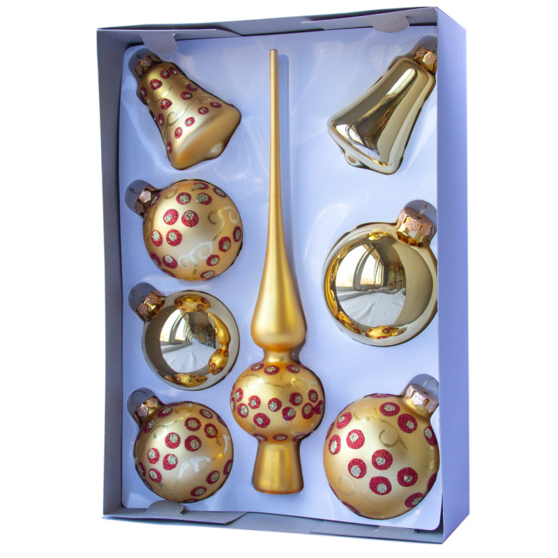 Набір ялинкових іграшок - кулі з верхівкою, 8 шт, D6-8 см, золотистий, у крапку, скло, мікс (390281-23)
