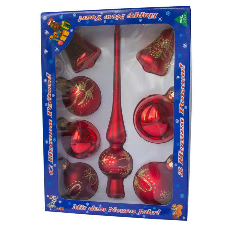 Набір ялинкових іграшок - кулі з верхівкою, 8 шт, D8 см, червоний, сніжинка, скло, мікс (390281-11)