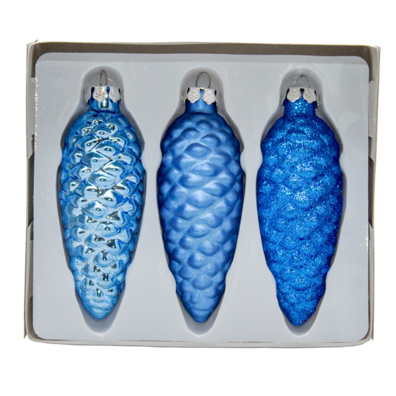 Набір ялинкових іграшок - шишки, 3 шт, 10 см, синій, скло (390137-4)