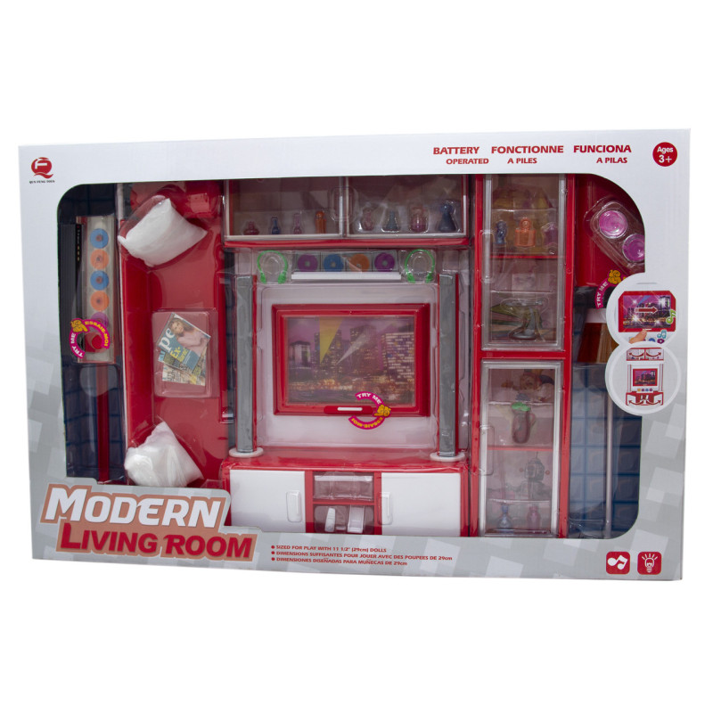 Набір лялькової меблів "Сучасна кімната". Набір лялькової меблів підходить для Барбі, Брац, Мокси, Штеффі і для інших найбільш улюблених ляльок. Набір володіє звуковими і світловими ефектами. Дитина зможе придумувати нові страви для своїх лялькових друзів, а також розвивати фантазію. Колір:червона, 54.5*10.5*35.5 см