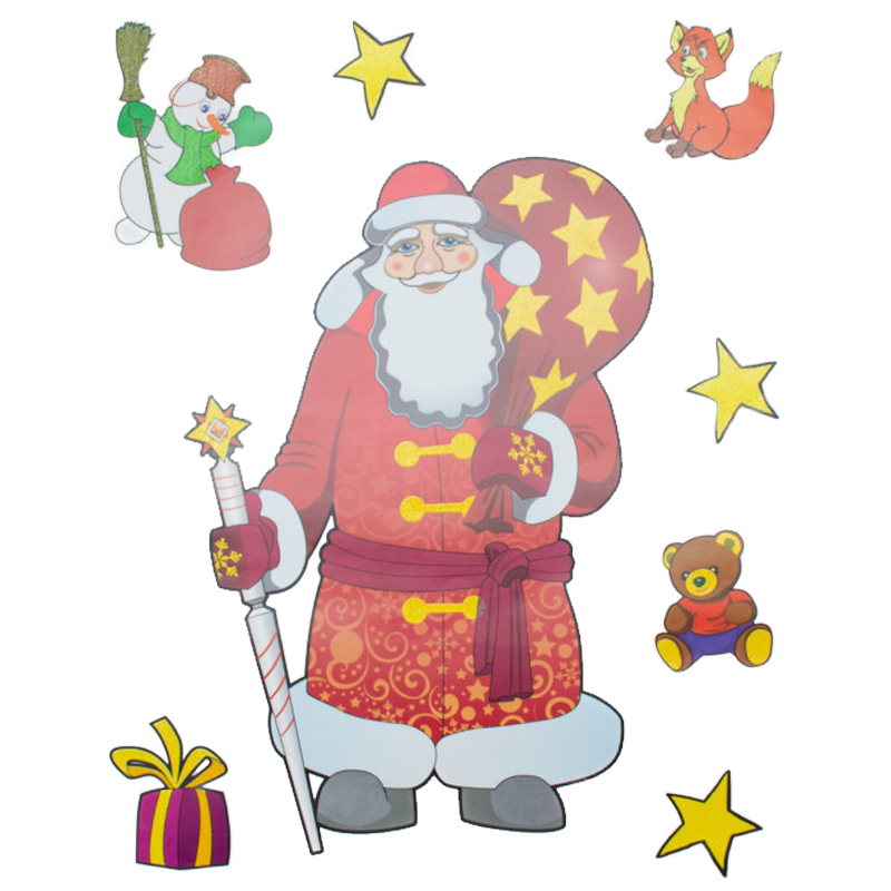 Новорічна прикраса - аркуш з наліпками Санта (Дід Мороз) та звірята, 70x50 см, червоний, ПВХ, папір (070151-1)