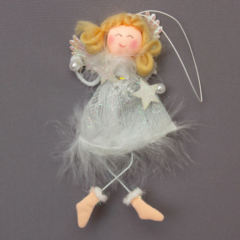 Новорічна ялинкова іграшка - фігурка Янголятко в білій сукні із зіркою, 15 см, білий, текстиль (220945-3)