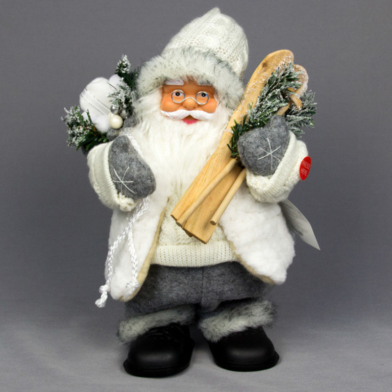 Новорічна інтерактивна фігурка Санта (Дід Мороз) в білому в'язаному одязі з подарунками та лижами, 25 см (230402)