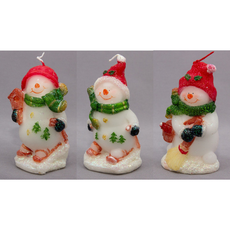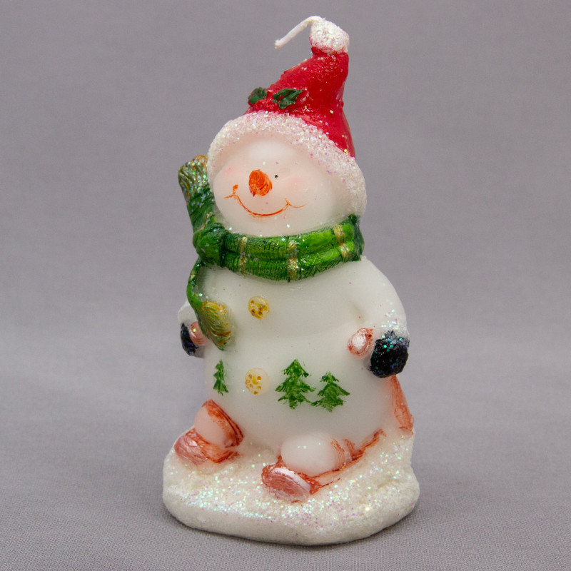 Свічка - Сніговик на лижах, 11 см, білий з червоним, парафін (791002-1)